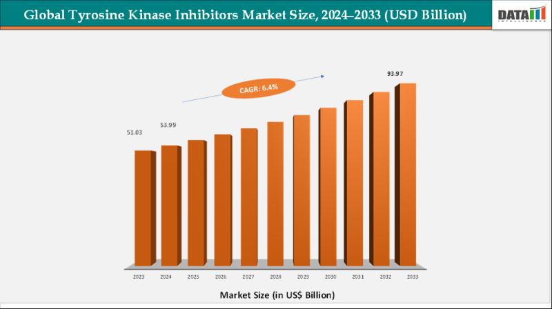 The Global Tyrosine Kinase Inhibitors Market size reached US$ 51.03 billion in 2023, with a rise to US$ 53.99 billion in 2024, and is expected to reach US$ 93.97 billion by 2033, growing at a CAGR of 6.4% during the forecast period 2025-2033.