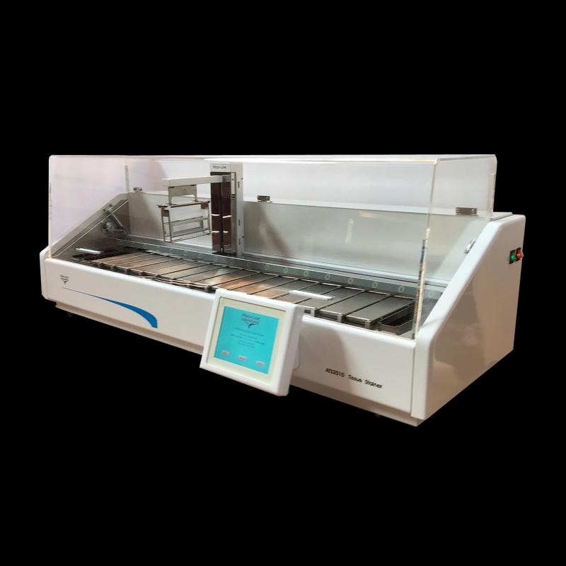 A slide stainer is a laboratory instrument used to apply stains or dyes to microscope slides, typically containing tissue or cell samples. This staining process enhances the contrast and visualization of cellular structures and components under a microscope, aiding in the diagnosis and analysis of biological specimens. Slide stainers automate and standardize the staining process, improving reproducibility and efficiency in histology, cytology, and other fields requiring detailed examination of samples.