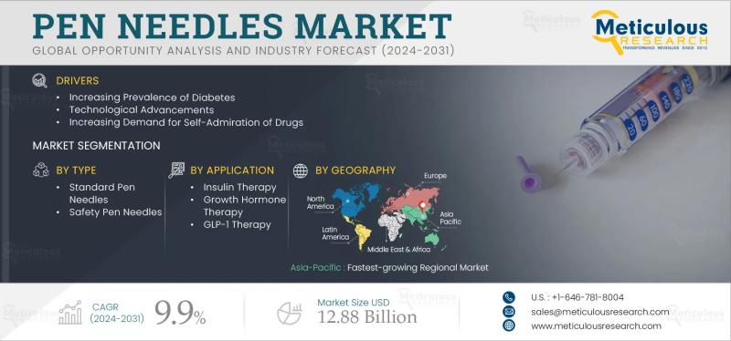 [Redding, California] - According to the latest report by Meticulous Research®, the global Pen Needles Market is projected to achieve a significant milestone, reaching $12.88 billion by 2031, with a compound annual growth rate (CAGR) of 9.9% during the forecast period. The market's expansion is fueled by the increasing prevalence of diabetes, heightened demand for self-administered drug therapies, technological advancements, and rising healthcare expenditures. Additionally, the growing preference for pen needles over traditional vials and syringes, coupled with favorable reimbursement policies and opportunities in emerging economies, are expected to drive market growth.However, the market faces certain challenges, including concerns over needlestick injuries, the reuse of pen needles, limited access to healthcare in developing regions, and a lack of awareness regarding the proper use of pen needles.
