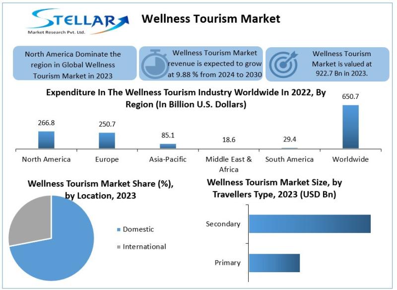 Global Wellness Tourism Market to reach USD 1808.5 Bn at a CAGR of 9.88 percent by 2030- Says Stellar Market ResearchStellar Market Research, a leading Healthcare business consultancy and research firm has published a report on the "Global Wellness Tourism Market". The total market opportunity for the Global Wellness Tourism Market was USD 922.7 Bn in 2023 and is expected to grow at a CAGR of 9.88 percent through the forecast period, reaching USD 1808.5 Bn by 2030. The Global Wellness Tourism Market is segmented into service, location, and travellers type for a better understanding of the market structure.