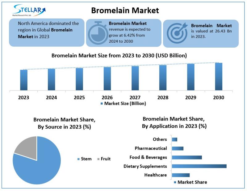 Bromelain Market to reach USD 42.55 Bn at a CAGR of 6.42 percent by 2030- Says Stellar Market ResearchStellar Market Research, a leading Healthcare Consulting firm has published a report on the "Bromelain Market". The total market opportunity for the Bromelain Market was USD 26.43 Bn. in 2023 and is expected to grow at a CAGR of 6.42 percent through the forecast period, reaching USD 42.55 Bn. by 2030. As per the Stellar Market Research report, the global Bromelain Market is expected to be dominated by Aisa Pacific to grow at a significant growth rate over the forecast period.