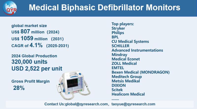 The global market for Medical Biphasic Defibrillator Monitors was estimated to be worth US$ 807 million in 2024 and is forecast to a readjusted size of US$ 1059 million by 2031 with a CAGR of 4.1% during the forecast period 2025-2031.