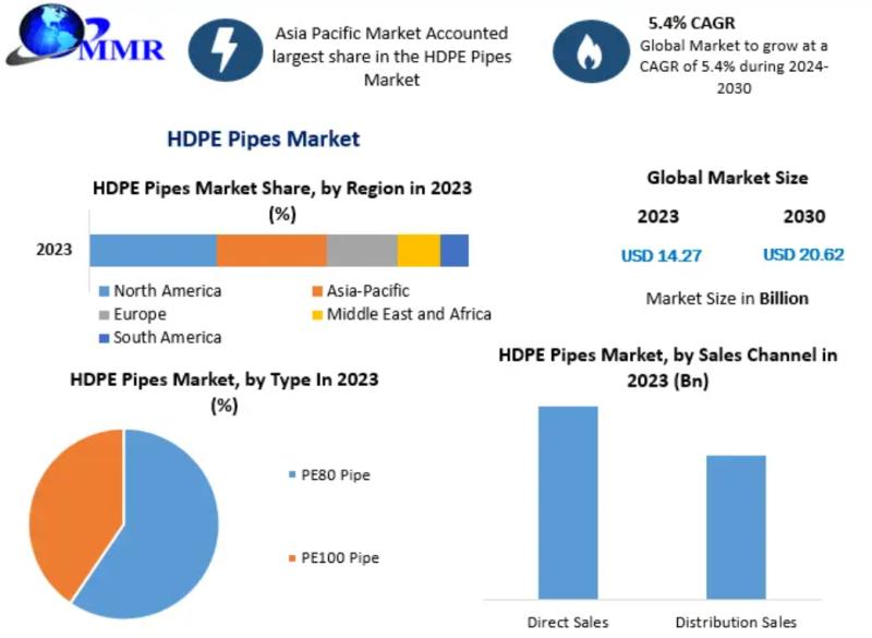 The global HDPE pipes market is on track for significant growth, projected to reach USD 20.62 billion by 2030, expanding at a CAGR of 5.4% during the forecast period. This growth is driven by the increasing use of HDPE pipes in diverse applications such as water supply, sewage systems, agriculture, and oil & gas. The market is segmented by type into PE 100 and PE 80, and by sales channels into direct and distribution sales. Regionally, North America, Latin America, Asia-Pacific, Europe, and the Middle East & Africa are key markets, with Asia-Pacific anticipated to lead in growth due to rising investments in infrastructure and polyethylene industry advancements.