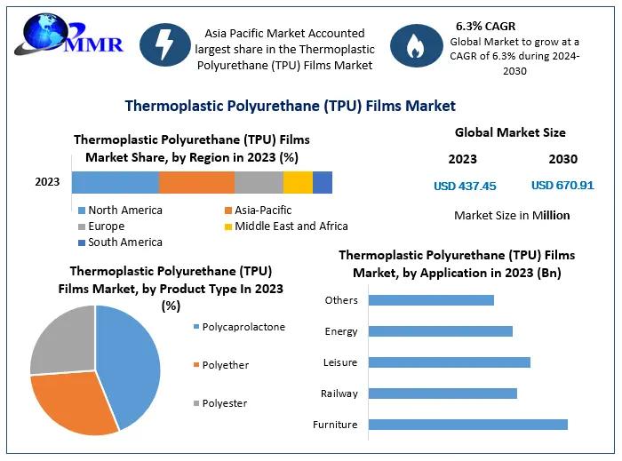 Anticipated Growth in Revenue:Thermoplastic Polyurethane (TPU) Films Market was valued US$ 437.45 Mn in 2023 and is expected to reach US$ 670.91 Mn by 2030, at a CAGR of 6.30 % during a forecast period.