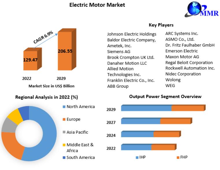 Forecast Increase in Revenue:Electric Motor Market size was valued at USD 129.47 Bn in 2022 and the total revenue is expected to grow at 6.9 percentage through 2023 to 2029, reaching nearly USD 206.55 Bn.