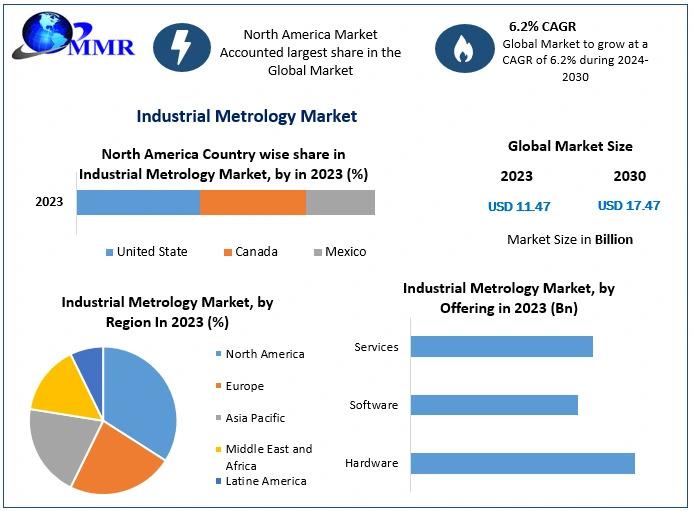 Forecast Increase in Revenue:Industrial Metrology Market size was valued at USD 11.47 Bn. in 2023. The total Industrial Metrology Market revenue is expected to grow at a CAGR of 6.2% from 2024 to 2030, reaching nearly USD 17.47 Bn. by 2030.