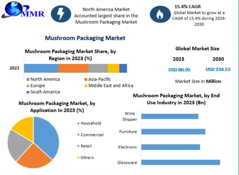Forecast Increase in Revenue:Mushroom Packaging Market was valued at US$ 86.05 Mn. in 2023 and is expected to reach USD 234.53 Mn. by 2030, at a CAGR of 15.4 percentage during a forecast period.