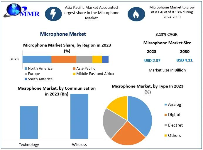 Forecast Increase in Revenue:Microphone Market size was valued at US$ 2.37 Bn. in 2023 and the total revenue is expected to grow at CAGR 8.13% through 2024 to 2030, reaching nearly US$ 4.11 Bn.