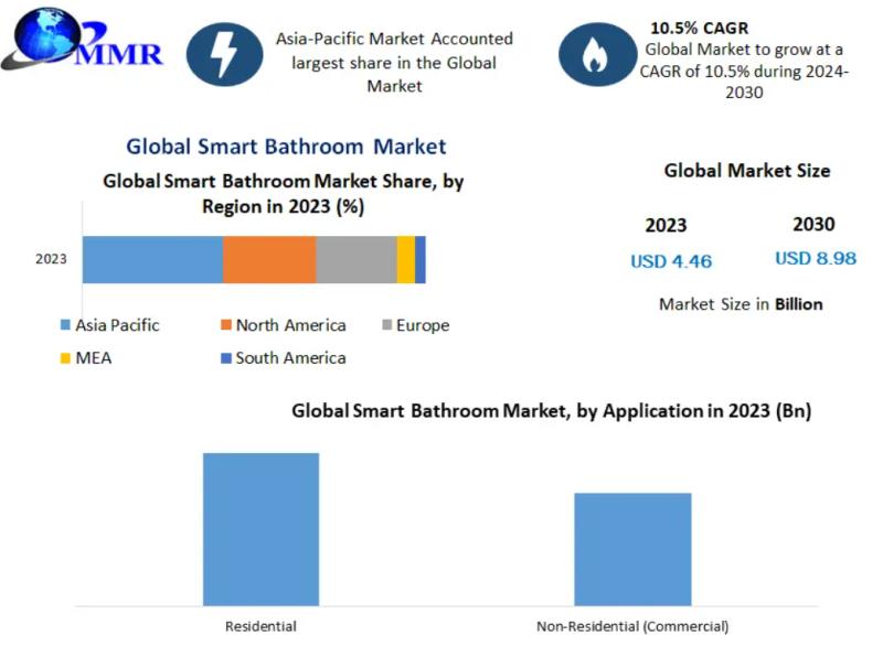 You can edit or delete your press release Smart Bathroom Market was valued at USD 4.46 Billion in 2023, and it is expected to reach USD 8.98 Billion by 2030, exhibiting a CAGR of 10.5 percentage during the forecast period (2024-2030) here