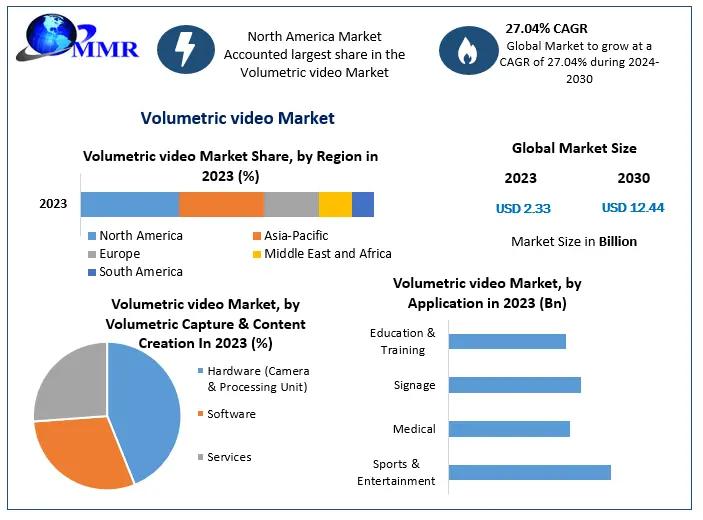 Volumetric Video Market Overview:The global volumetric video market is driven by the demand for 360-degree cameras and processing units, fueled by AR and VR needs in filmmaking and gaming. It is segmented into hardware (camera & processing unit), software, and services. Applications span sports & entertainment, medical, signage, and education & training. Geographically, North America leads the market, expected to see significant growth due to high adoption in sports, events, and entertainment sectors.