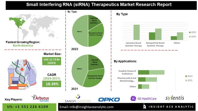 Small Interfering RNA (siRNA) Therapeutics Market is valued at US$ 12.73 billion in 2023, and it is expected to reach US$ 48.46 Billion by 2031, with a CAGR of 18.39% during the forecast period of 2024-2031.InsightAce Analytic Pvt. Ltd. announces the release of a market assessment report on the " [https://www.insightaceanalytic.com/report/small-interfering-rna-sirna-therapeutics-market/2629] - (By Type (Liposome-Based Systemic Therapy, Nanoparticle-Based Systemic Therapy, Other), By Application (Hospital, Research Institutions, Pharmaceutical and Biotechnology Companies, Academic Institutions, Other)), Trends, Industry Competition Analysis, Revenue and Forecast To 2031."