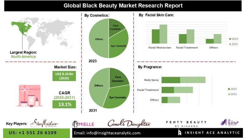 Black Beauty Market is valued at US$ 8.24 Bn in 2023, and it is expected to reach US$ 21.71 Bn by 2031, with a CAGR of 13.1% during the forecast period of 2024-2031.InsightAce Analytic Pvt. Ltd. announces the release of a market assessment report on the " [https://www.insightaceanalytic.com/report/black-beauty-market/2684] - (By Cosmetics (Face Cosmetic, Eye Cosmetic, Lip Cosmetic, Others), By Facial Skin Care (Facial Moisturizer, Facial Treatment, Eye Skin Care, Others), By Fragrance (Cologne & Perfume, Body Spray, Gift Sets, Others), By Hair Care (Hair Accessories, Conditioner, Styling Products, Others), By HBL (Body Lotion, Eczema & Psoriasis, Others)), Trends, Industry Competition Analysis, Revenue and Forecast To 2031."