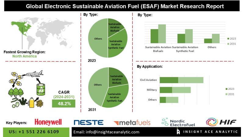 Electronic Sustainable Aviation Fuel (ESAF) Market is expected to expand with a CAGR of 48.2% during the forecast period of 2024-2031.InsightAce Analytic Pvt. Ltd. announces the release of a market assessment report on the " [https://www.insightaceanalytic.com/report/electronic-sustainable-aviation-fuel-esaf-market/2665] - (By Type (Sustainable Aviation Biofuels, Sustainable Aviation Synthetic Fuel), By Application (Civil Aviation, Military)), Trends, Industry Competition Analysis, Revenue and Forecast To 2031."