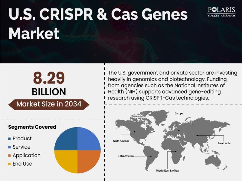 U.S. CRISPR & Cas Genes Market is currently valued at USD 1.54 Billion in 2024 and is anticipated to generate an estimated revenue of USD 8.29 Billion by 2034, according to the latest study by Polaris Market Research. Besides, the report notes that the market exhibits a robust 18.4% Compound Annual Growth Rate (CAGR) over the forecasted timeframe, 2025 - 2034