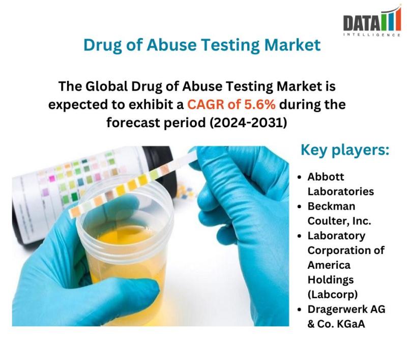 The Global Drug of Abuse Testing Market is expected to exhibit a CAGR of 5.6% during the forecast period (2024-2031)The global drug abuse testing market is experiencing increased demand, driven by the benefits these devices offer in managing drug addiction and preventing overdoses. The growing incidence of drug-related mortality, coupled with stringent regulations mandating alcohol and drug testing, and expanded government initiatives, are key factors contributing to the market's growth. These developments underscore the expanding role of drug abuse testing in addressing public health concerns and enhancing safety.