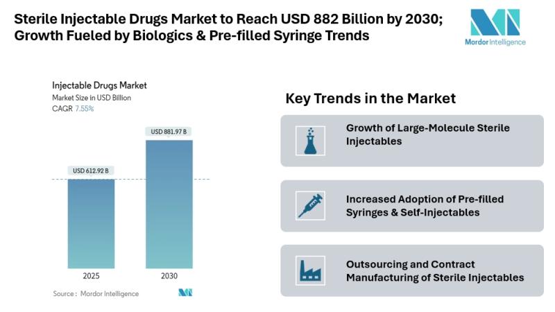 The sterile injectable drugs market [https://www.mordorintelligence.com/industry-reports/sterile-injectable-drugs-market?utm_source=abnewswire] is poised for strong expansion over the coming years. According to Mordor Intelligence, the sterile injectable drugs market is projected to grow from approximately USD613billion in 2025 to USD882billion by 2030, reflecting a compound annual growth rate (CAGR) of about 7.55%.
