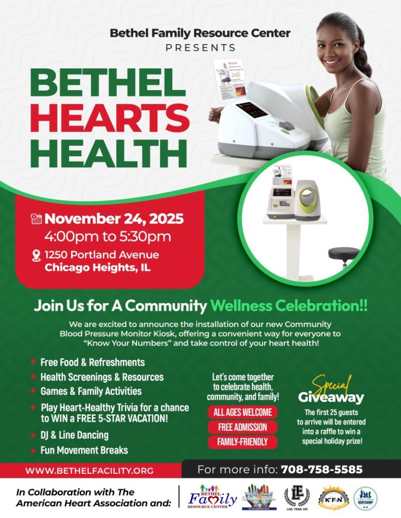 Chicago Heights, IL - Bethel Family Resource Center will host "Bethel Hearts Health," a free community wellness celebration on November 24, 2025, from 4:00 PM to 5:30 PM at 1250 Portland Avenue in Chicago Heights. The event marks the official launch of a new Community Blood Pressure Monitor Kiosk designed to provide residents with easy…