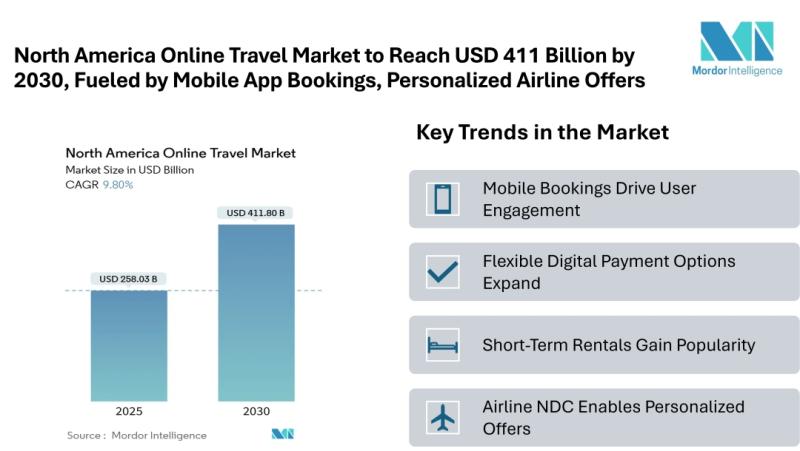 According to Mordor Intelligence, the North America online travel market size [https://www.mordorintelligence.com/industry-reports/online-travel-market-in-north-america?utm_source=abnewswire] currently stands at USD 258.03 billion in 2025 and is expected to climb to USD 411.80 billion by 2030, reflecting a 9.80% CAGR over the period.