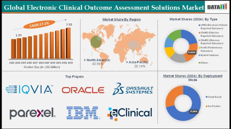 The Global Electronic Clinical Outcome Assessment Solutions Market size reached US$ 1.93 Billion in 2024 from US$ 1.67 Billion in 2023 and is expected to reach US$ 7.93 Billion by 2033, growing at a CAGR of 17.1% during the forecast period 2025-2033.