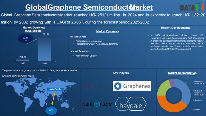 As per DataM intelligence research report" Global Graphene Semiconductors Market reached US$ 251.21 million in 2024 and is expected to reach US$ 1,321.20 million by 2032, growing with a CAGR of 23.06% during the forecast period 2025-2032." High-performance electronics and miniaturization trends are driving research and adoption of graphene semiconductors.