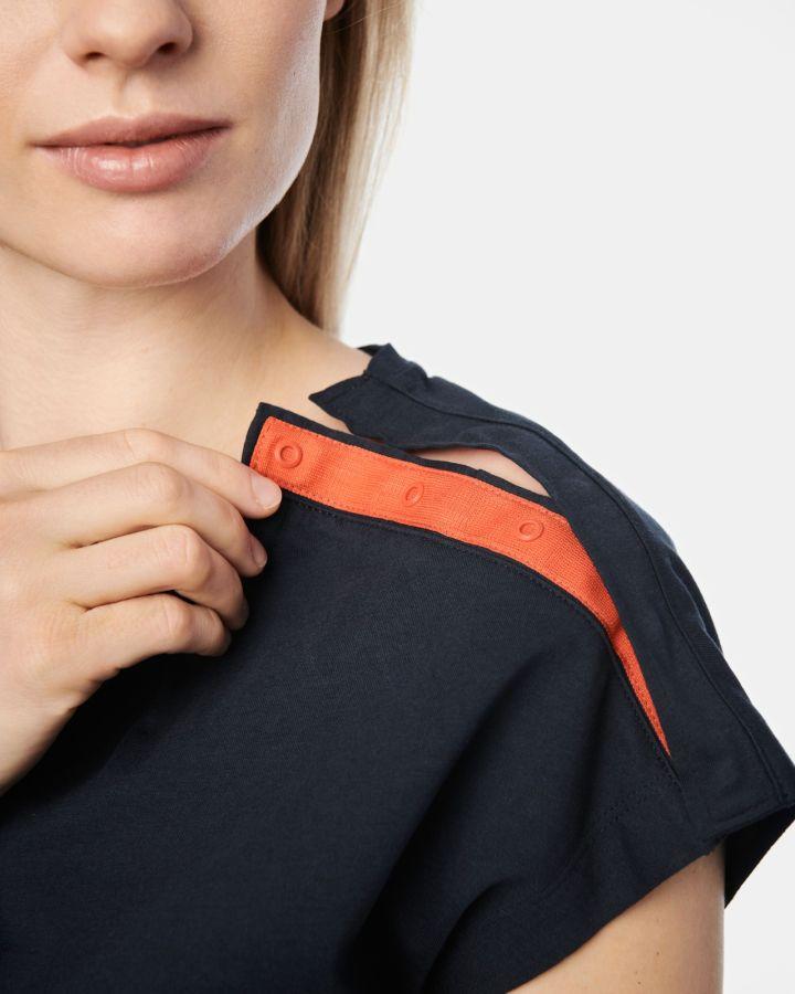 However, the tops are not just an aid for people with restricted mobility. They are also perfect for medical examinations. Opening the fasteners is all it takes to access a specific part of the body. This means that patients do not have to expose their entire upper body. This preserves privacy, whether during physiotherapy, a gynecological breast examination or when administering chemotherapy via a port.