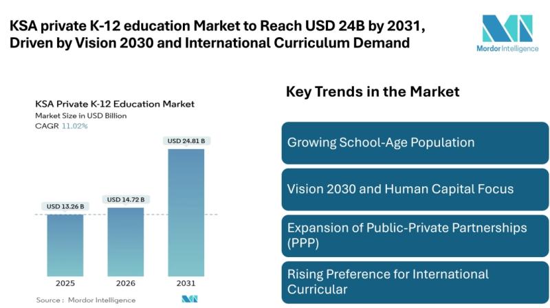 According to Mordor Intelligence, the KSA private K-12 education market size [https://www.mordorintelligence.com/industry-reports/ksa-private-k12-education-market?utm_source=abnewswire] was valued at USD 13.26 billion in 2025 and is estimated to grow from USD 14.72 billion in 2026 to reach USD 24.81 billion by 2031, registering a CAGR…
