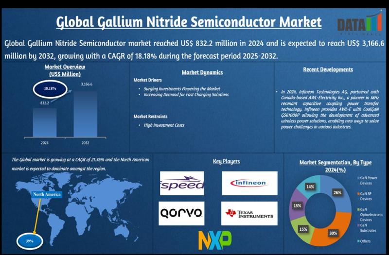 The Gallium Nitride Semiconductor Market reached US$ 832.2 million in 2024 and is projected to grow significantly, reaching US$ 3,166.6 million by 2032, expanding at a CAGR of 18.18% during the forecast period 2025 to 2032. The market is witnessing robust expansion driven by rising demand for high efficiency, high performance semiconductor solutions across consumer electronics, automotive, telecommunications, and renewable energy industries.