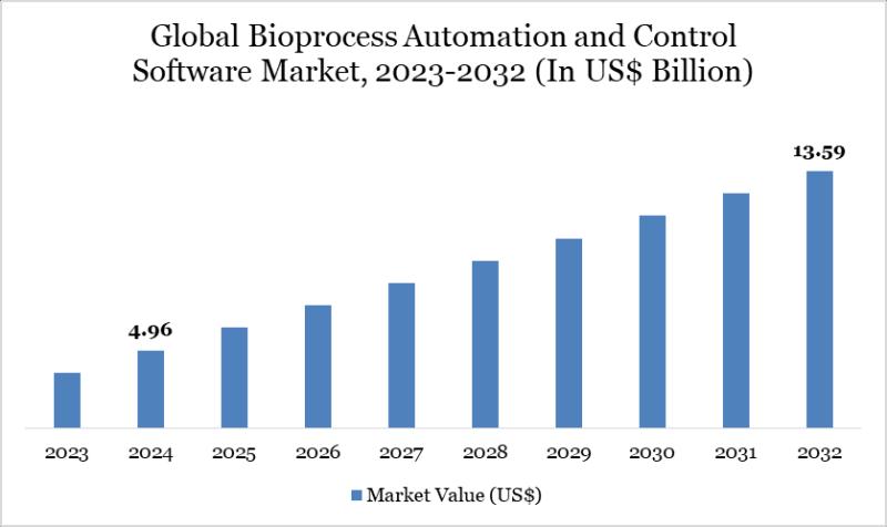 The Bioprocess Automation and Control Software Market reached US$4.96 billion in 2024 and is expected to reach US$13.59 billion by 2032, growing at a CAGR of 13.7% during the forecast period of 2025-2032.