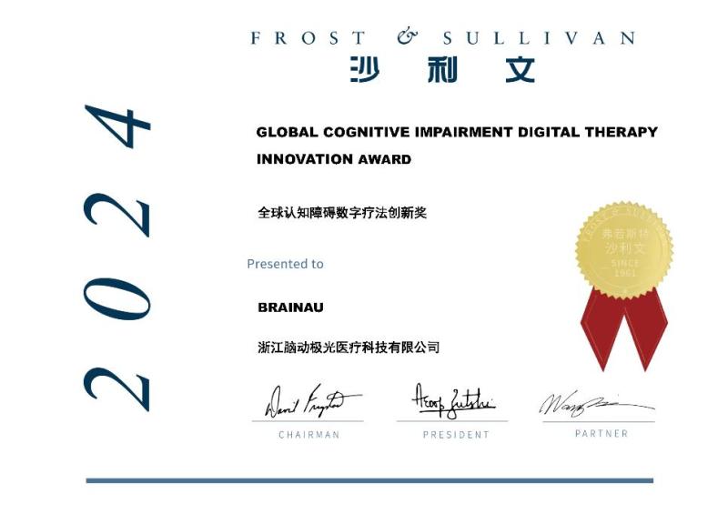 The Frost & Sullivan Global Leadership Award recognizes enterprises' outstanding performance and exceptional achievements in areas such as technology innovation, market potential, customer service, branding, and others. The Frost & Sullivan team nominated a group of competitive and excellent enterprises through methods including in-depth interviews, industry analysis, and secondary research. An independent judging panel, made up of third-party investment and financing experts, financial experts, bankers, and renowned listed company entrepreneurs, conducted rigorous evaluations of the nominated enterprises and decided to grant 2024 Global Cognitive Impairment Digital Therapy Innovation Award to BRAINAU.