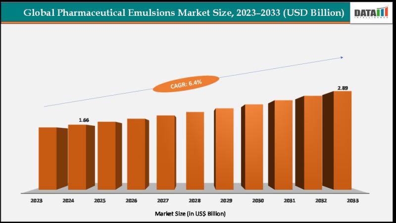 As per DataM intelligence research report "The global pharmaceutical emulsions market size reached US$1.66Billion in 2024 from US$1.57Billionin 2023 and is expected to reach US$ 2.89Billion by 2033, growing at a CAGR of 6.4%during the forecast period 2025-2033."