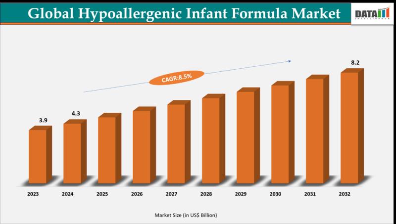 As per DataM intelligence research report "The global hypoallergenic infant formula market reached US$ 3.9 billion in 2023, rising to US$ 4.3 billion in 2024 and is expected to reach US$ 8.2 billion by 2032, growing at a CAGR of 8.5% from 2025 to 2032."