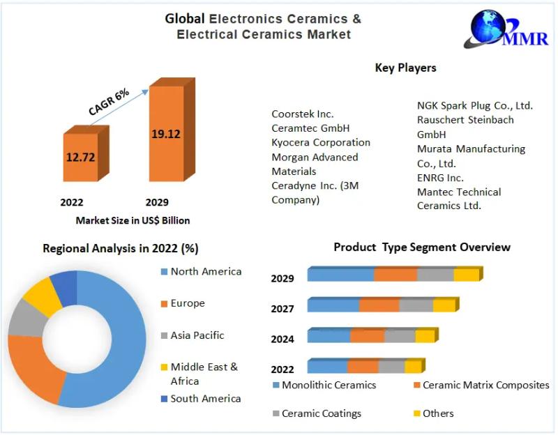 Forecast Increase in Revenue:Electronics Ceramics & Electrical Ceramics Market was valued at USD 12.72 Bn in 2022, and it is expected to reach USD 19.12 Billion by 2029, exhibiting a CAGR of 6 % during the forecast period (2023-2029)