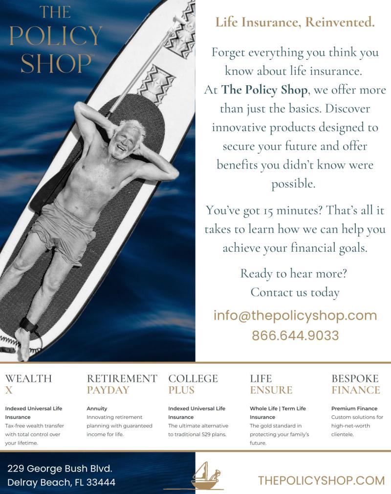 About The Policy Shop: Located in Delray Beach, Florida, The Policy Shop is committed to helping individuals and families secure their futures through innovative life insurance and annuity solutions. Specializing in unique and customized financial strategies, The Policy Shop is revolutionizing how Americans prepare for their retirement and protect their families.