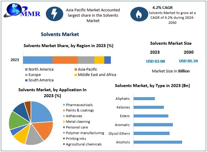 Forecast Increase in Revenue:Solvents Market was valued at US$ 63.98 Bn in 2023 and is expected to reach US$ 85.34 Bn by 2030, at a CAGR of 4.2% during a forecast period.
