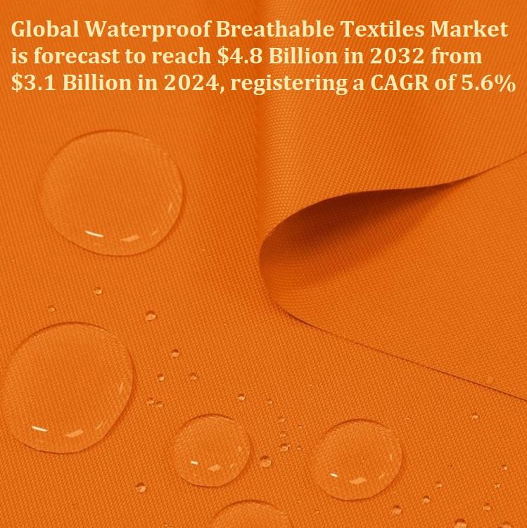 Global Waterproof Breathable Textiles Market is forecast to reach $4.8 Billion in 2032 from $3.1 Billion in 2024, registering a CAGR of 5.6%