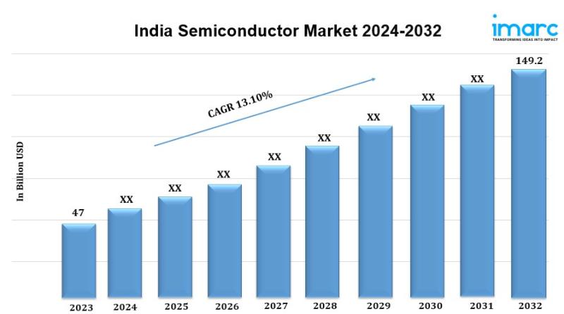 The India semiconductor market is rapidly growing, driven by increasing demand for electronics, automotive, and telecom sectors, fostering innovation and investment. According to the latest report by IMARC Group, the market size reached USD 47 Billion in 2023. Looking forward, IMARC Group expects the market to reach USD 149.2 Billion by 2032, exhibiting a growth rate (CAGR) of 13.10% during 2024-2032.