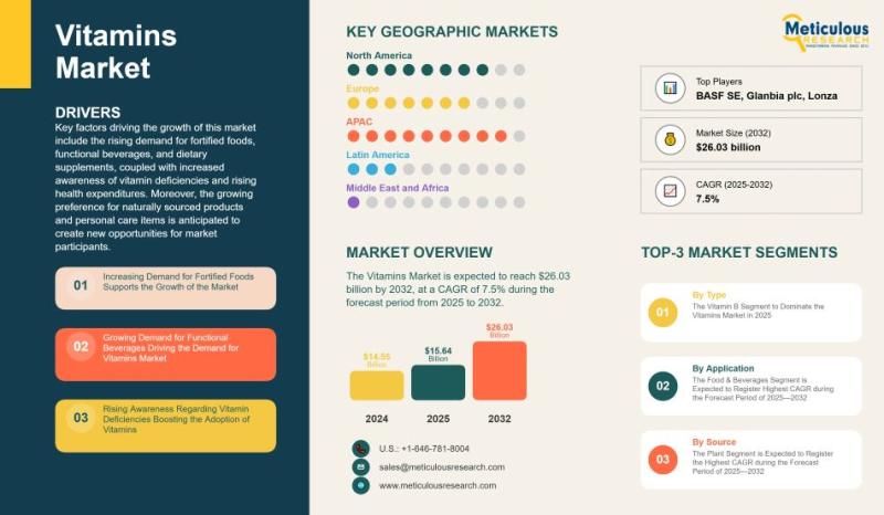 The global vitamins market is on a steady growth path, supported by changing consumer habits and a stronger focus on health and wellness. In 2024, the market stood at USD 14.55 billion and is expected to reach USD 26.03 billion by 2032, growing at a CAGR of 7.5% from 2025 onwards. This growth isn't sudden or isolated it reflects a broader shift toward preventive healthcare, where people are actively trying…
