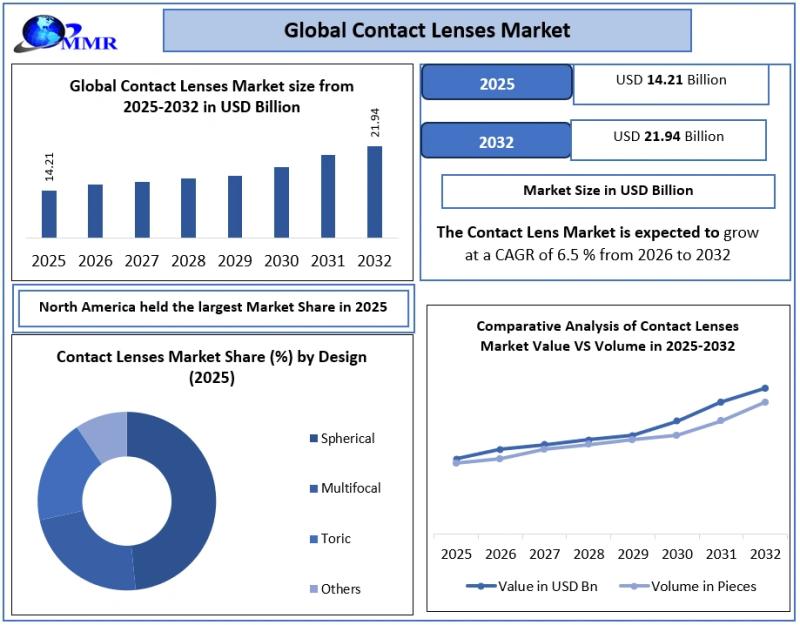 The Global Contact Lenses Market, valued at USD 14.21 Bn in 2025, is set to expand robustly at a CAGR of 6.5% through 2032, reaching approximately USD 21.94 Bn.