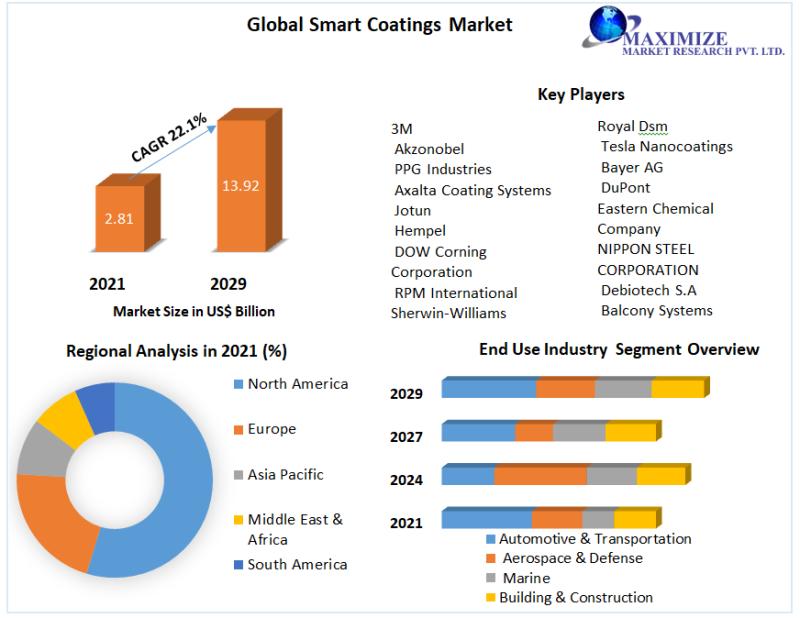 At a compound annual growth rate (CAGR) of 22.1%, the smart coatings market is anticipated to reach US$ 13.92 billion by 2029.