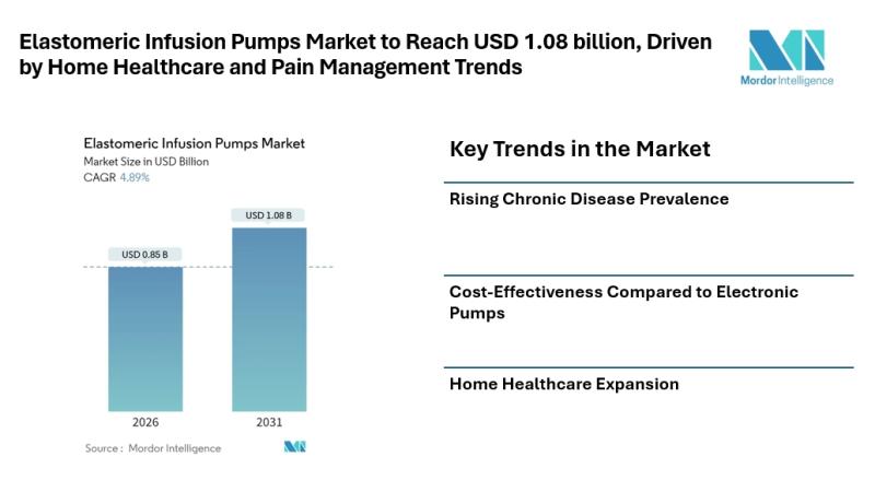 The elastomeric infusion pumps market [https://www.mordorintelligence.com/industry-reports/elastomeric-infusion-pumps-market?utm_source=abnewswire] size in 2026 is estimated at USD 0.85 billion, growing from 2025 value of USD 0.81 billion with 2031 projections showing USD 1.08 billion, growing at 4.89% CAGR over 2026-2031. Growth is fueled by the rising adoption of home-based care, supportive reimbursement…