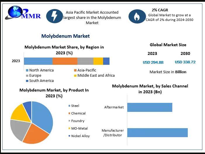 Molybdenum Market is expected to reach USD 338.72 Bn by 2030, as per Maximize Market Research.Molybdenum Market is anticipated to reach US$ 338.72 Bn. by 2030 from US$ 294.88 Bn. in 2023 at a CAGR of 2 % during a forecast period.