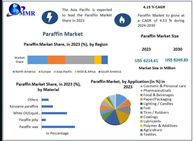 Paraffin Market is expected to reach USD 8249.83 Million by 2030, as per Maximize Market Research.The Paraffin Market size was valued at USD 6214.61 Million in 2023 and the total Paraffin Market revenue is expected to grow at a CAGR of 4.13 % from 2024 to 2030, reaching nearly USD 8249.83 Million.