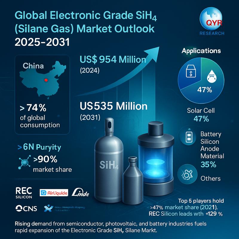 Los Angeles, United States - According to the latest market research study published by QY Research, the Global Electronic Grade SiH4 Silane Gas Market is poised for substantial growth over the forecast period 2025-2031. Valued at US$ 954 million in 2024, the market is projected to reach US$ 5358 million by 2031, expanding at a CAGR of 30.0%.