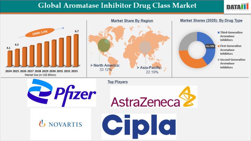 aromatase inhibitor drug class market reached US$4.1 Billion in 2024, rising to US$4.3 Billion in 2025 and is expected to reach US$6.7 Billion by 2033, growing at a CAGR of 5.5% from 2026 to 2033.