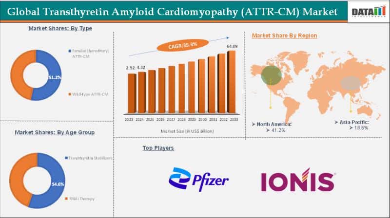 The Transthyretin amyloid cardiomyopathy (ATTR-CM) was valued at US$ 2.92 Billion n 2023. The global transthyretin amyloid cardiomyopathy (ATTR-CM) market size reached US$ 4.32 Billion in 2024 and is expected to reach US$ 64.09 Billion by 2033, growing at a CAGR of 35.3% during the forecast period 2025-2033.The market is growing due to rising disease awareness, improved diagnostic techniques, increasing elderly population, and advancements in targeted therapies. Regulatory approvals…