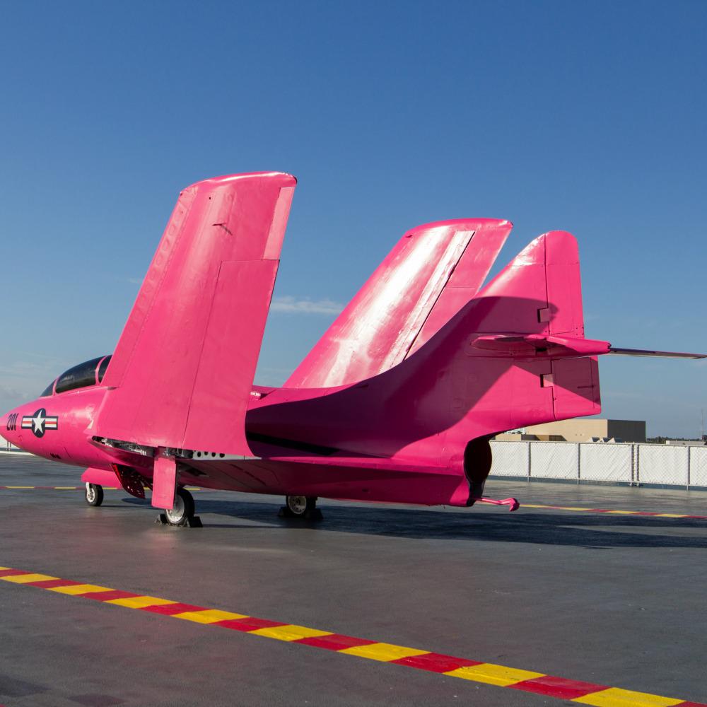 The USS Lexington today unveiled the very first F9F-8 Cougar painted in pink. The F9F-8 Cougar will be on display on the flight deck of this WWII era aircraft carrier through the end of October in support of Breast Cancer Awareness.The idea was presented by the Director of Operations & Exhibits, Rusty Reustle, from a technique he observed Disney using while filming the blockbuster movie, Pearl Harbor, aboard LEX. Dishwashing liquid is applied to latex paint and prevents the paint from becoming permanent. The paint color on the F9F-8 Cougar is a vibrant shade of pink called “Heliconia.”