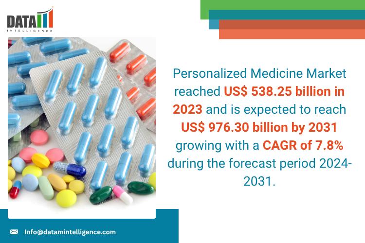 Personalized Medicine Market reached US$ 538.25 billion in 2023 and is expected to reach US$ 976.30 billion by 2031 growing with a CAGR of 7.8% during the forecast period 2024-2031.