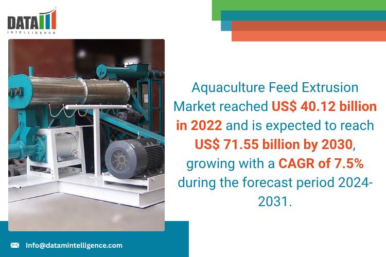 Aquaculture Feed Extrusion Market reached US$ 40.12 billion in 2022 and is expected to reach US$ 71.55 billion by 2030, growing with a CAGR of 7.5% during the forecast period 2024-2031.