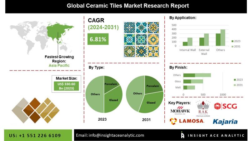 InsightAce Analytic Pvt. Ltd. announces the release of a market assessment report on the "Global Ceramic Tiles Market Size, Share & Trends Analysis Report By Product Type (glazed, porcelain and scratch Free), Application (floor, internal wall and external wall), End-User (residential and Non-residential)- Market Outlook And Industry Analysis 2031"The global ceramic tiles market is estimated to reach over USD 551.82 billion by 2031, exhibiting a CAGR of 6.72% during the forecast period.