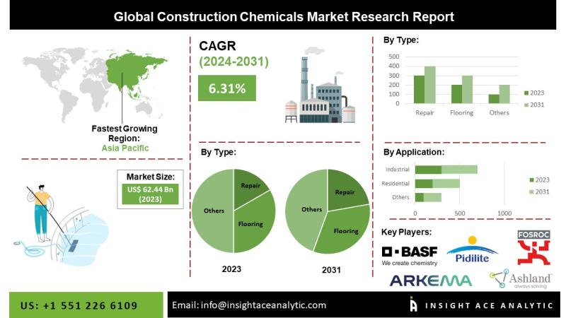 InsightAce Analytic Pvt. Ltd. announces the release of a market assessment report on the "Global Construction Chemicals Market Size, Share & Trends Analysis Report By Type (Concrete Admixtures, Water Proofing & Roofing, Repair, Flooring, Sealants & Adhesives, Asphalt Additives, Flame-retardants, shrinkage reducing agents, bond breakers, and mold release agents) by Application (Residential, Industrial/Commercial, Infrastructure and Repair structures)- Market Outlook And Industry Analysis 2031"The global construction chemicals market is estimated to reach over USD 99.74 billion by 2031, exhibiting a CAGR of 6.22% during the forecast period.